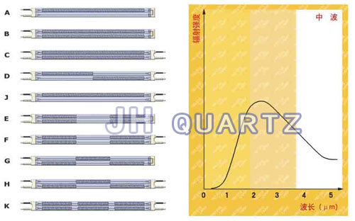 中波石英燈采用鐵鉻鋁電阻絲做發(fā)熱體,波長(cháng)在 2.2-3.5 微米之間。